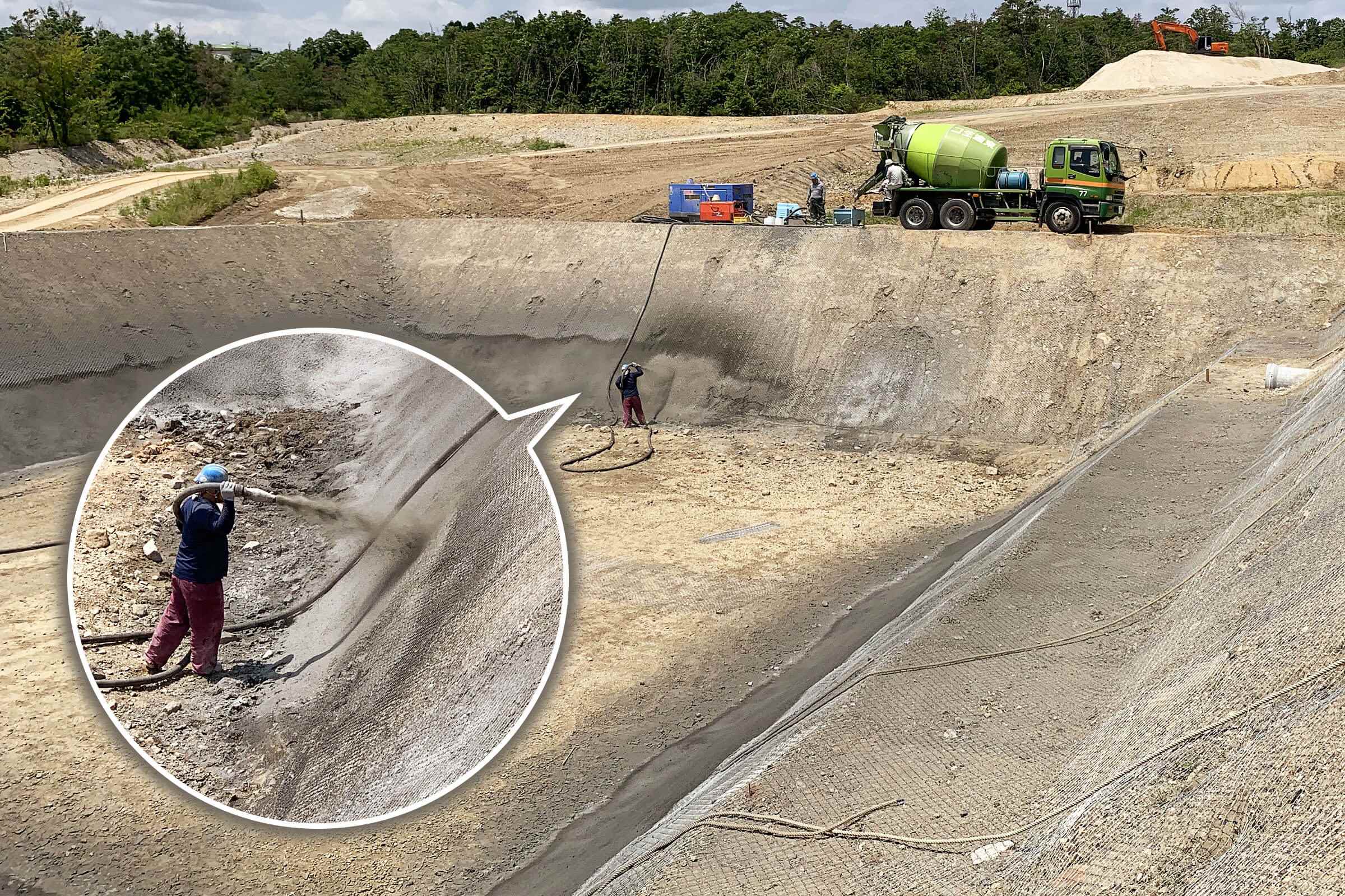 調整池にコンクリート吹き付け工事